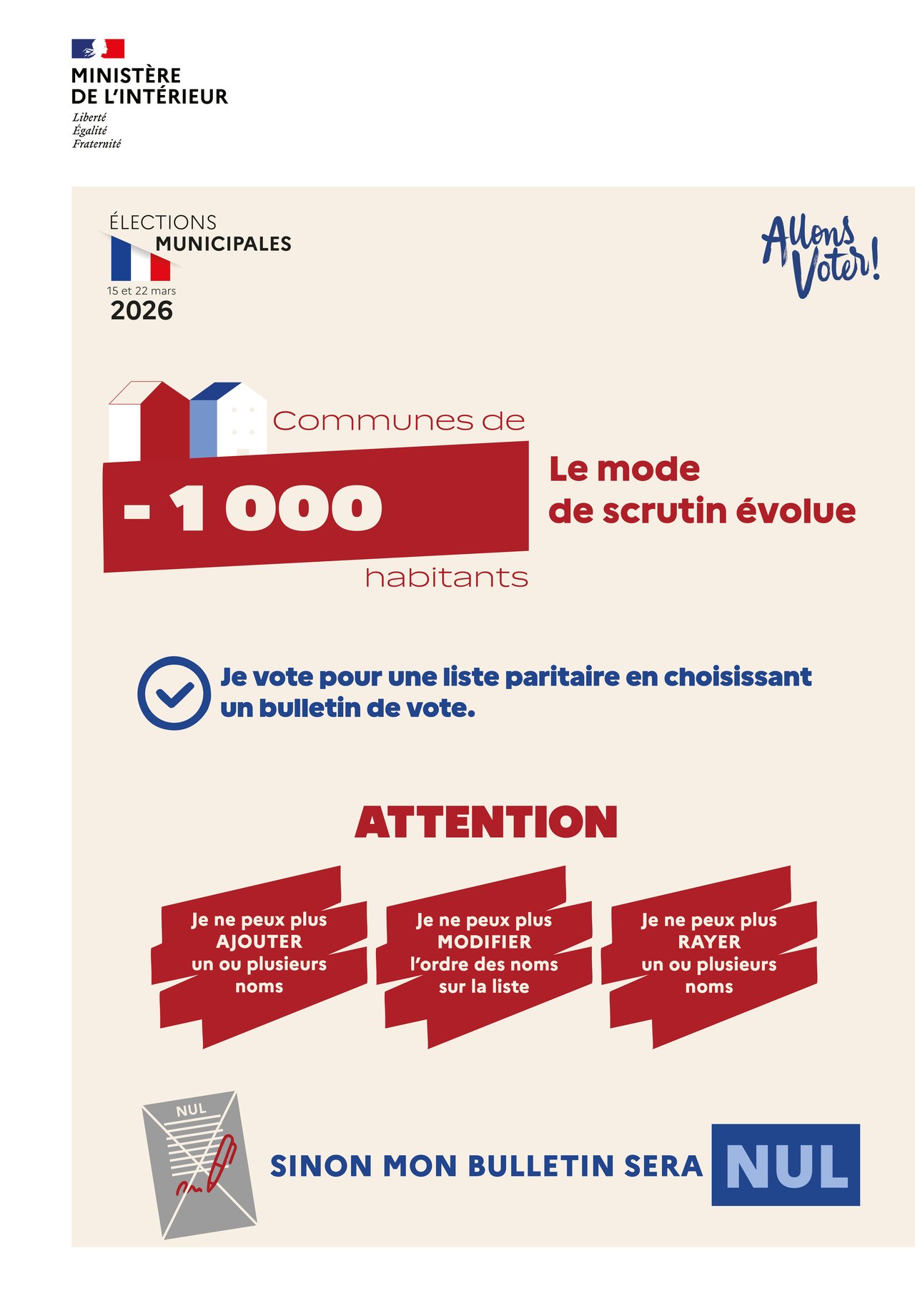 - scrutin paritaire (alternance femme/homme). Vous pourrez seulement voter en faveur d’une liste. Il n’est plus possible de voter pour des candidats qui se présentent individuellement.