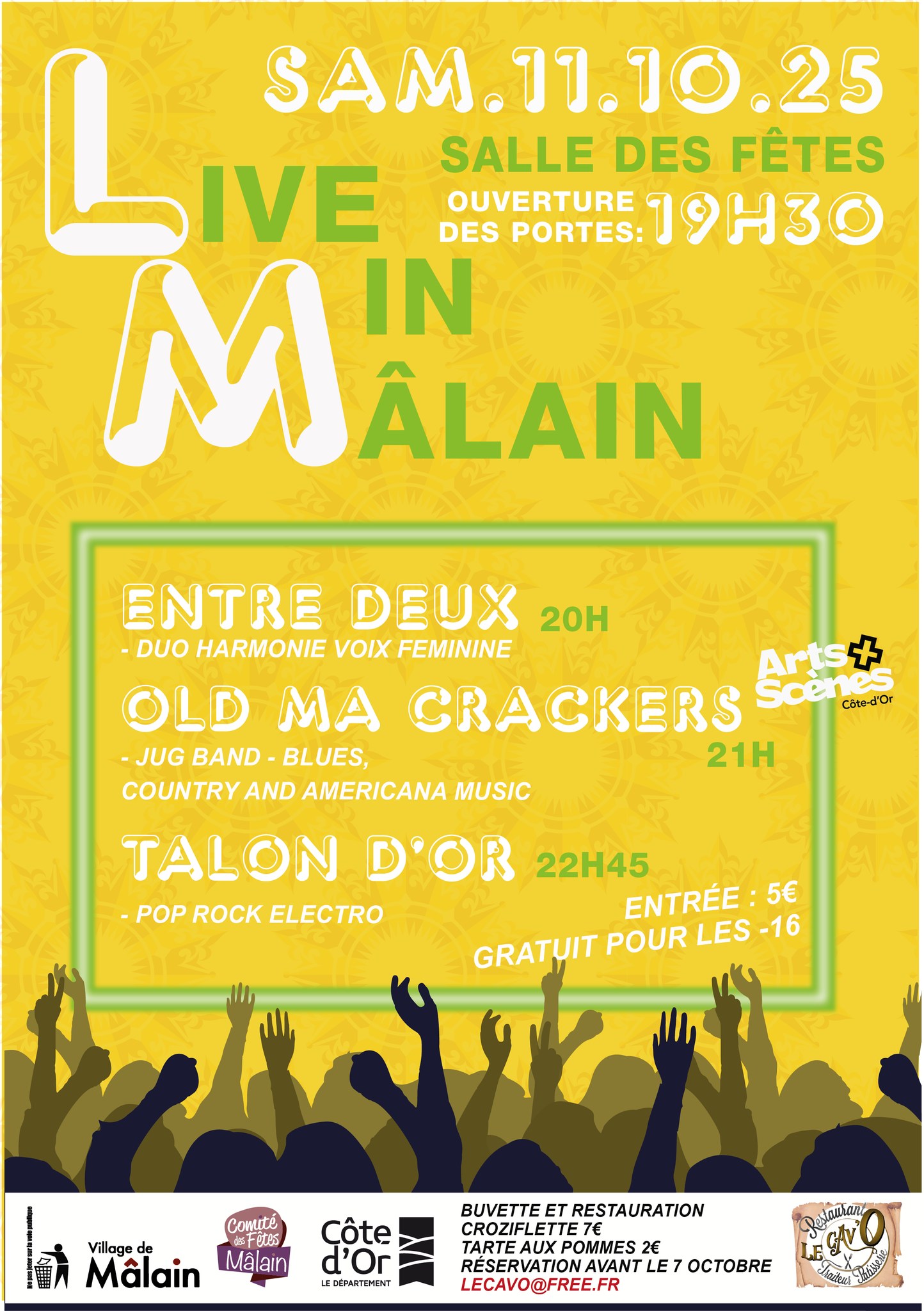 Live In Mâlain est de retour le samedi 11 octobre à 19h30, à la salle des fêtes !! Une soirée concert de folie, en 3 temps.